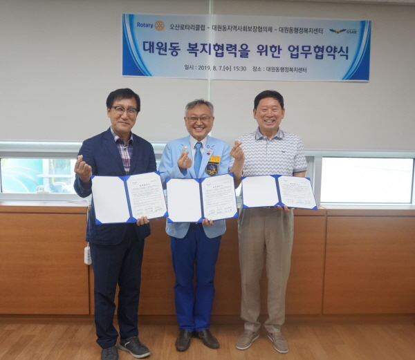 이번 협약을 통해 오산로타리클럽에서는 앞으로 대원동 내 복지소외계층에게 다양한 복지서비스를 제공하기 위해 지역사회와 협력하고 인적·물적으로 지원을 하겠다고 약속했다.