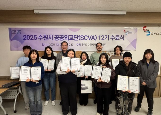 미디어라이프 중부신문 이종인 기자 | 수원시국제교류센터가 22일 센터에서 ‘수원시 공공외교단(SCVA) 12기’ 수료식을 열고, 단원 16명에게 수료증을 전달했다. 우수활동자 4명에게는 상장을 수여했다.
