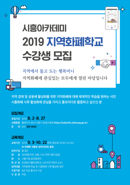 수강신청은 시흥시 평생교육원 홈페이지에서 할 수 있으며 신청자격은 지역, 성별, 나이 등의 제한 없이 지역화폐에 관심 있는 모든 시민들에게 열려있다. 수강료는 무료이며 4강 이상 수강자에게 수료증이 전달된다. 문의사항은 시흥시청 소상공인과로 하면 된다.