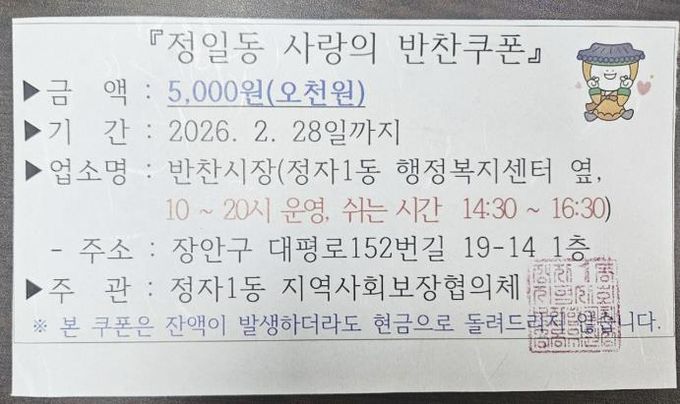 미디어라이프 중부신문 이종인 기자 | 수원시 장안구 정자1동 지역사회보장협의체는 금년부터 관내 취약계층 가구를 대상으로 매월 5가구에 2만원 상당의 반찬쿠폰을 지급하는 사업을 시작한다고 지난 13일 밝혔다.