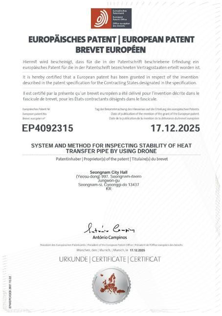 미디어라이프 중부신문 이종인 기자 | 성남시가 자체 개발한 ‘드론을 이용한 열수송관 안정성 검사 시스템’이 유럽특허(등록번호 EP4092315) 등록을 완료했다고 밝혔다. 이는 시 최초의 해외특허 등록 사례로, 지식재산의 해외 권리화를 통해 유럽 수출길을 여는 계기가 될 것으로 기대된다.