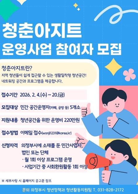 미디어라이프 중부신문 이석호 기자 | 의정부시는 청년들이 일상 속에서 자유롭게 모이고 활동할 수 있도록 생활밀착형 청년공간 ‘청춘아지트’ 사업에 참여할 민간사업자를 모집한다.