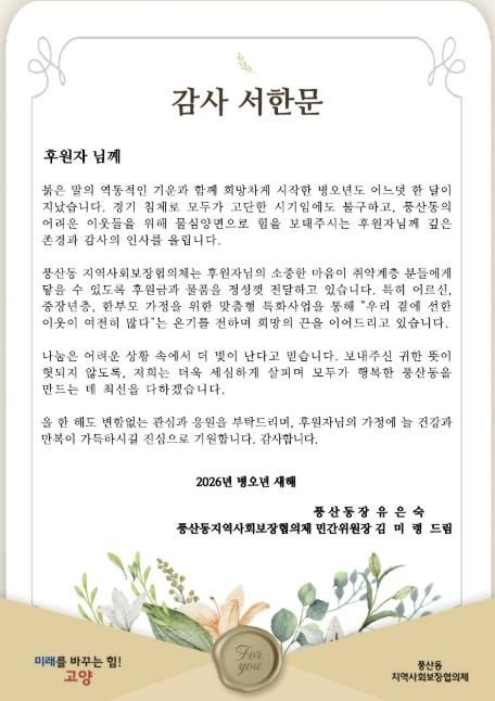 미디어라이프 중부신문 이종인 기자 | 고양특례시 일산동구 풍산동 지역사회보장협의체는 설명절을 앞둔 지난 3일 지난해 지역사회의 어려운 이웃을 위해 따뜻한 나눔을 실천한 후원자들에게 감사의 마음을 담은 서한문을 발송했다.