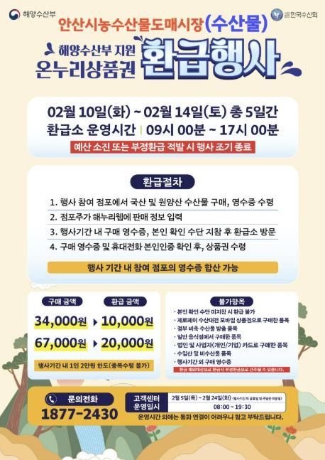 미디어라이프 중부신문 이종인 기자 | 안산시는 설 명절을 맞아 국산 수산물 소비 촉진과 도매시장 활성화를 위해 오는 10일부터 14일까지 5일간 ‘2026년 설 온누리상품권 환급행사’를 개최한다고 5일 밝혔다.