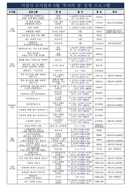 독서의 달 프로그램을 9월 한 달 간 이천시 공공도서관에서 운영될 예정이며 시민들에게 도서관에서 즐기며 배우고 함께하는 다양한 기쁨을 선사할 것이다.