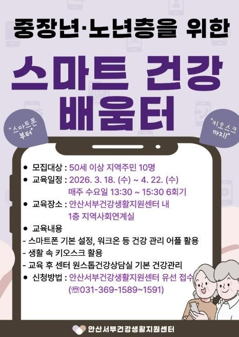 미디어라이프 중부신문 이종인 기자 | 안산시는 단원보건소 서부건강생활지원센터는 오는 18일부터 ‘중장년‧노년층을 위한 스마트 건강 배움터’를 운영한다고 6일 밝혔다.