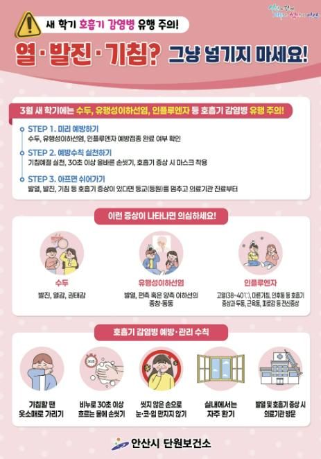 미디어라이프 중부신문 이종인 기자 | 안산시 단원보건소는 새 학기를 맞아 유치원과 초·중·고등학교를 중심으로 호흡기 감염병 발생 증가가 우려됨에 따라 학생과 교직원의 각별한 주의를 당부했다.