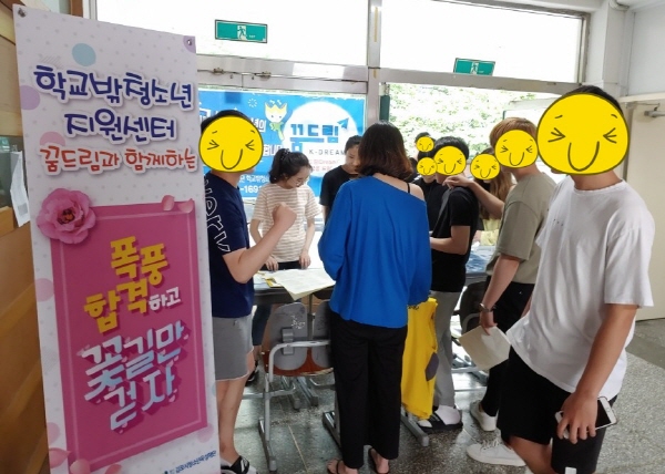 이날 아웃리치는 고사장을 방문하는 1천여 명의 검정고시 응시 학교 밖 청소년 및 학부모 등을 대상으로 응원 간식을 배부하고 학교 밖 청소년 무료 건강검진 안내·접수, 학교밖청소년지원센터 홍보 및 상담 서비스를 지원했다.