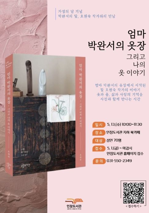 미디어라이프 중부신문 최부일 기자 | 구리시립도서관은 '호원숙 작가와의 만남 ‘엄마 박완서의 옷장, 그리고 나의 이야기’' 참여 신청을 오는 5월 1일부터 접수한다고 밝혔다.