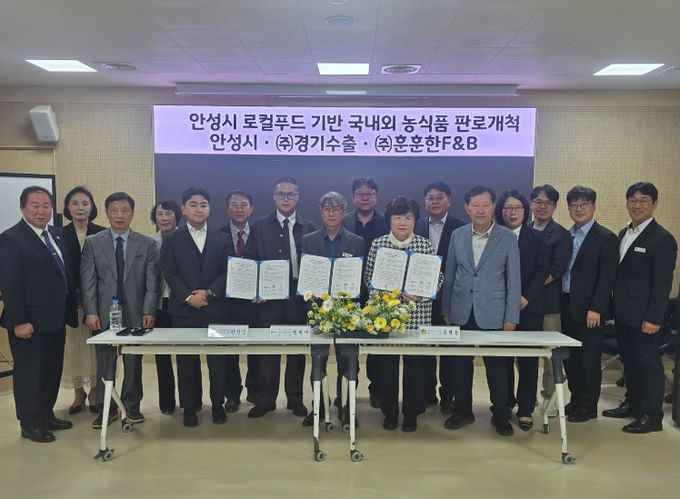 미디어라이프 중부신문 이종인 기자 | 안성시 농업기술센터는 지난 4월 17일, 안성시 농특산물 및 농식품의 국내외 판로 확대를 위해 ㈜경기수출, ㈜훈훈한F&B와 전략적 업무협약(MOU)을 체결했다고 밝혔다.