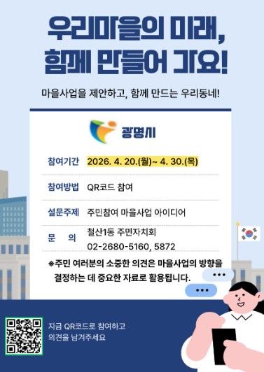 양애순 철산1동장은 “주민들의 소중한 의견이 마을 발전의 밑거름이 될 수 있도록 적극 지원하겠다”며 “앞으로도 주민자치 활성화를 위한 행정적 지원을 아끼지 않겠다”고 밝혔다.