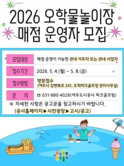 미디어라이프 중부신문 최부일 기자 | 여주도시공사는 2026년 오학물놀이장 운영을 앞두고 이용객 편의 제공을 위한 매점 운영자를 공개 모집한다고 밝혔다.