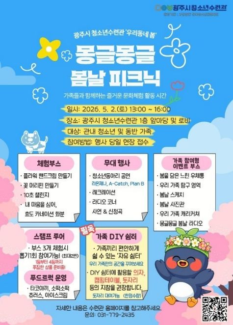 미디어라이프 중부신문 이종인 기자 | 광주시 청소년수련관은 오는 5월 2일 오후 1시부터 수련관 1층 앞마당 및 로비에서 ‘2026년 우리동네 봄 몽글몽글 봄날 소풍’을 개최한다고 23일 밝혔다.