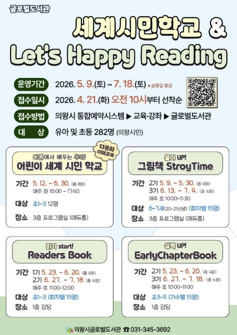 미디어라이프 중부신문 이종인 기자 | 의왕시 글로벌도서관이 책을 통해 세상을 이해하고 체험하는 다문화 이해 프로그램 '어린이 세계 시민 학교'와 영어 읽기 문해력 향상을 위한 단계별 맞춤 프로그램 'Let’s Happy Reading'의 참여자를 모집한다.