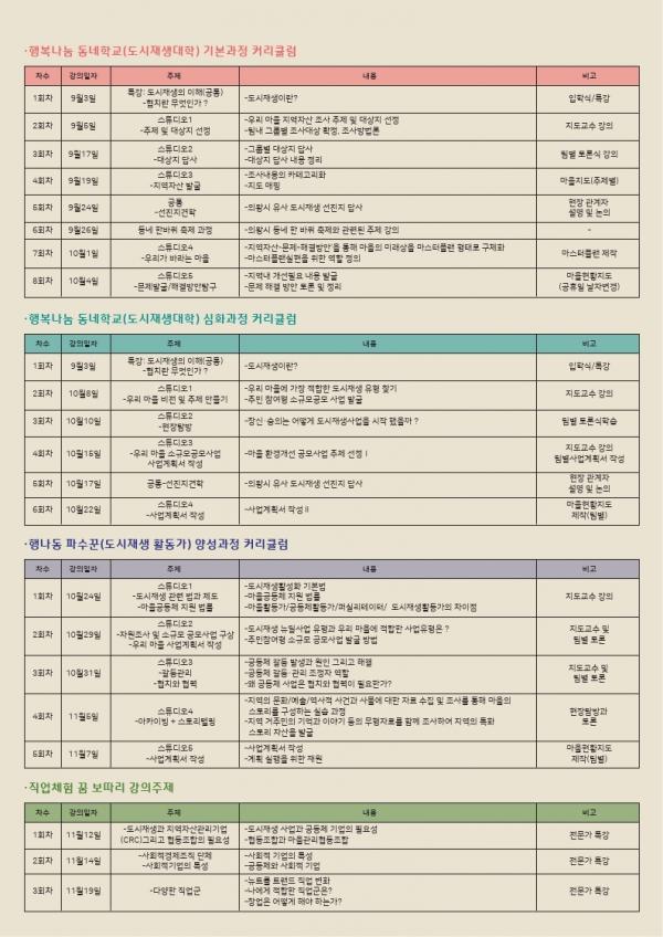 도시재생대학은 도시재생에 대한 이해를 도울 수 있는 행복나눔 동네학교 기본과정과 심화과정, 도시재생 활동가를 양성하는 행나동 파수꾼 양성과정, 도시재생과 관련된 직업들을 체험할 수 있는 직업체험 꿈보따리 과정 등으로 운영된다.