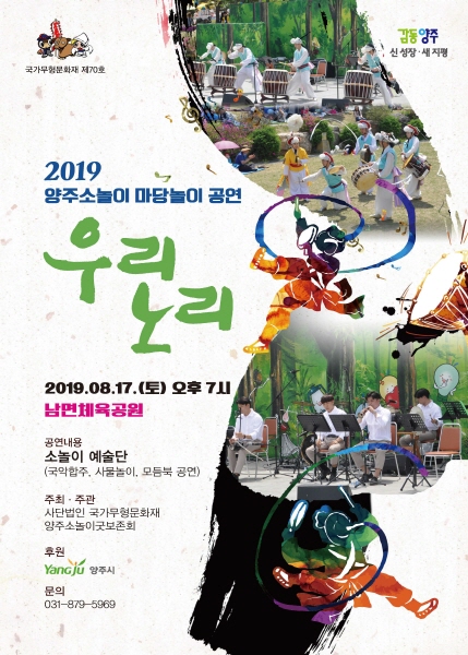 양주시는 오는 17일 토요일 저녁 7시 남면신산체육공원에서 사단법인 국가무형문화재 양주소놀이굿보존회의 소놀이 마당놀이 ‘우리노리’공연이 펼쳐진다고 밝혔다.