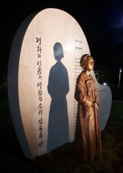 또한 지난 4월에 공모와 심사를 거쳐 안경진작가의 작품을 선정했다. 이 작품은 ‘1992년 용기있게 일본의 만행을 폭로하면서 일본의 사죄를 촉구한 김복동 할머니 상’이다. 그리고 동상에 희망의 빛을 쏘아 벽면에 어린 소녀의 그림자가 나타난 모습을 형상화했다.