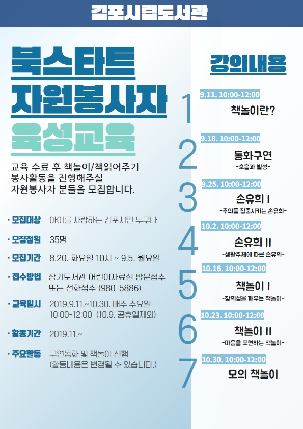 교육 수료 후 자원봉사를 희망하는 김포시민은 8월 20일 10시부터 장기도서관 어린이자료실로 방문 접수하거나 031-980-5886으로 전화접수 할 수 있으며 총 35명을 모집한다.