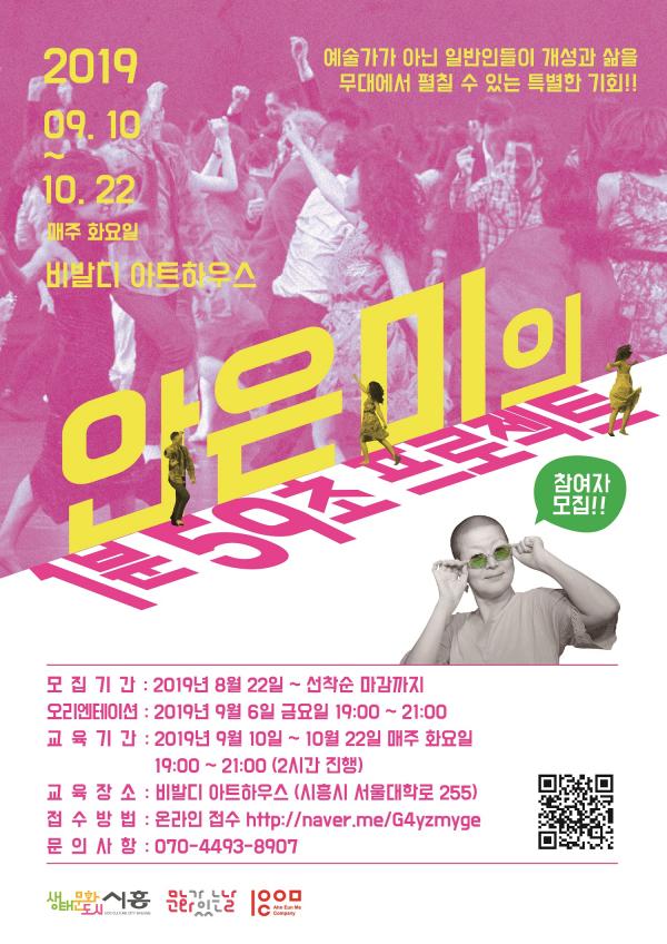 ‘안은미 1분 59초’ 프로젝트는 9월 10일부터 10월 22일까지 주 1회 비발디 아트하우스에서 진행된다. 인문학강좌와 움직임워크숍, 조별면담을 통해 참여자가 직접 제작한 1분 59초 작품을 10월 26일 ABC행복학습타운 ABC홀에서 결과공연으로 개최할 예정이다.