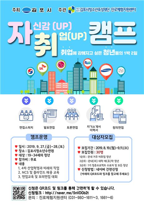 청년 자·취 캠프에서는 4차 산업혁명과 신직업 관련 교육 및 블라인드 채용 이력서 및 자기소개서 작성법은 물론 다양한 면접기법 교육, 모의면접을 통한 경험 등 기업에서 원하는 다양한 인재의 조건을 충족시킬 수 있는 다양한 프로그램이 마련 돼 있다.