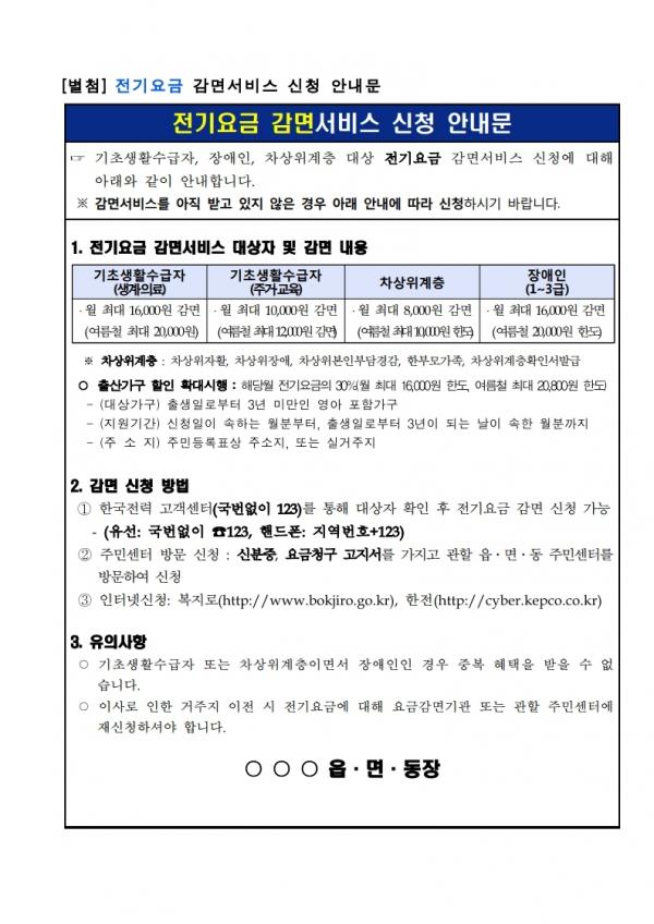 읍면동행정복지센터에서는 기초생활수급자, 차상위계층, 장애인가구 등 저소득층의 요금 감면대상자 중 실제 감면을 받지 못하고 있는 가구에게 ‘전기요금 감면서비스 신청 안내문’을 개별 발송할 계획이다.