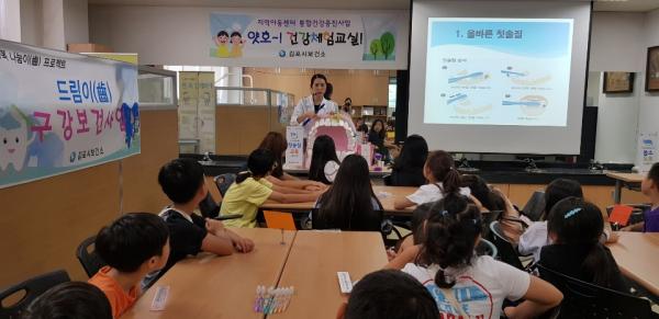 특히, ‘깨끗한 내치아 만들기‘라는 주제로 큐스캔을 이용해 치면 세균막 검사 및 양치 체험을 실시해 아이들의 호기심 유발과 치아건강의 중요성을 알렸으며, 학령기 고른 음식섭취 및 아침식사의 중요성을 일깨워 주고자 영양교육 및 바른 음주 문화조성을 위한 금주교육도 병행해 아이들의 통합건강증진을 지도했다.