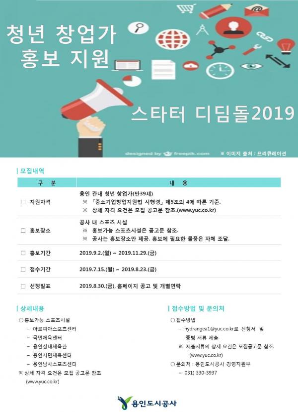 용인도시공사는 12일 홍보 수단 지원을 원하는 관내 청년 창업가를 오는 15일부터 8월23일까지 모집한다고 밝혔다.