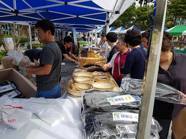장터에서는 관내 20개 농가에서 생산한 백옥쌀, 과일, 채소, 버섯, 전통장, 가공식품 등 100여 품목의 농·특산물을 시중보다 10~20% 저렴한 가격에 판매한다.