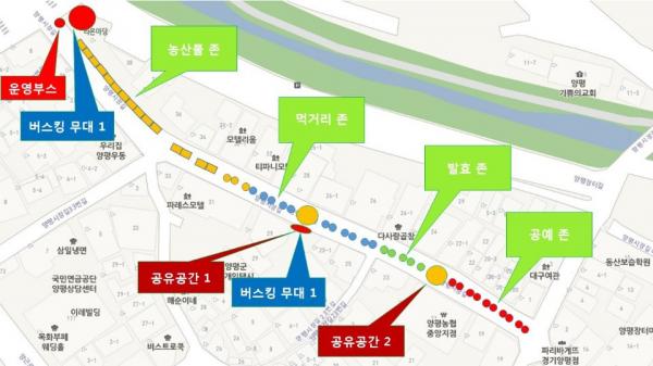 특히, 매주 마켓이 개장될 때 사업구간은 인조잔디가 깔린 차없는 거리가 조성되어 남녀노소, 가족 단위 고객이 마음껏 즐길 수 있는 문화의 거리가 펼쳐지며, 양평물맑은시장 쉼터 광장 상설무대, 라온광장, 문화의 거리 중간 버스킹 존에서는 군민과 관광객이 즐길 수 있는 문화공연과 버스킹이 동시에 펼쳐지게 되어 시장을 방문한 고객의 눈과 귀를 즐겁게 할 예정이다.