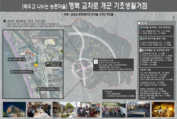 개군면 기초생활거점육성사업은 ‘배우고 나누는 농촌마을, 행복 교차로 개군 기초생활거점’의 비전으로 세바퀴 평생학습을 강화하여 특화교육 육성 및 지원, 문화·복지 지원 확대, 공동체 활동 및 주민역량 증대의 전략으로 추진할 계획이다.