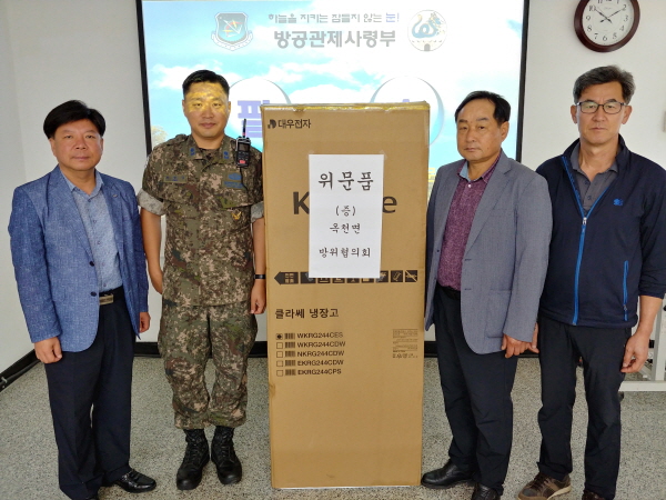 [미디어라이프(medialife)] 옥천면 방위협의회에서는 지난 11일 312관제대대를 방문하여 조국의 안보를 책임지는 장병들의 노고에 감사의 마음을 담아 위문품으로 냉장고를 전달했다.