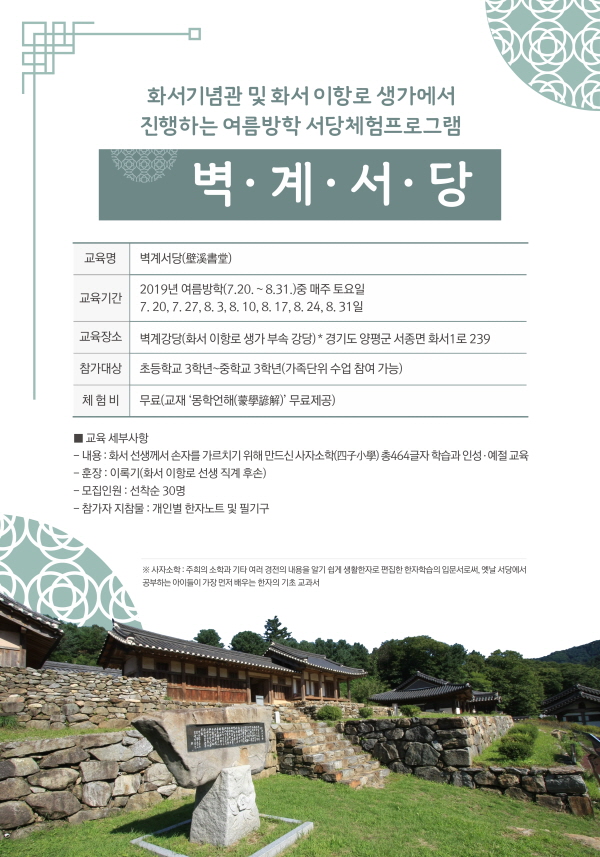 총 7회로 구성된 이번 교육은 화서 이항로 선생께서 생전에 손자를 가르치기 위해 만드신 사자소학문을 현대적으로 해석한 ‘몽학언해’ 교재로 진행되며, 화서선생의 직계후손에 의한 직강으로 총464글자에 대한 학습과 인성예절이 초등학교 3학년에서 중학교 3학년 학생을 대상으로 진행된다.