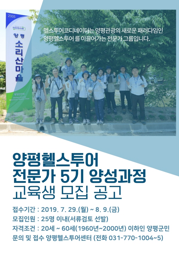 양평헬스투어는 지역의 자연자원과 관광·레저를 연계, 1박 이상 양평에서 체류할 수 있도록 양평 형 헬스투어로 재설계해 운영하고 있는 건강여행 프로그램이다.