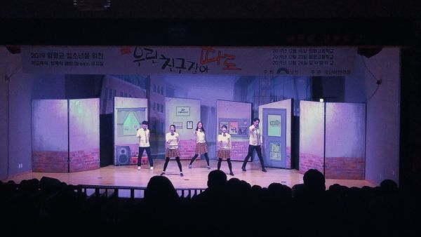약 900여명의 학생들에게 보여진 ‘우린 친구잖아, 따로’ 라는 뮤지컬은 흡연, 왕따 등의 사회문제와 꿈과 진로에 대한 청소년들의 고민, 올바른 성지식 습득이라는 문제를 뮤지컬이라는 문화 콘텐츠로 흥미롭게 다가갈 수 있도록 만들어진 공연이다.