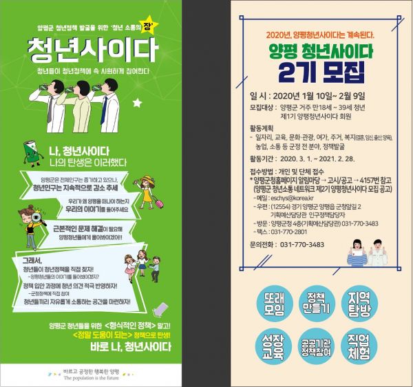 제2기의 모집기간은 10일부터 2월 9일까지이며 모집대상은 양평군 거주 만18세~39세 청년과 제1기 청년사이다 회원 중 희망자이며 3월 1일부터 1년간 활동하게 된다.