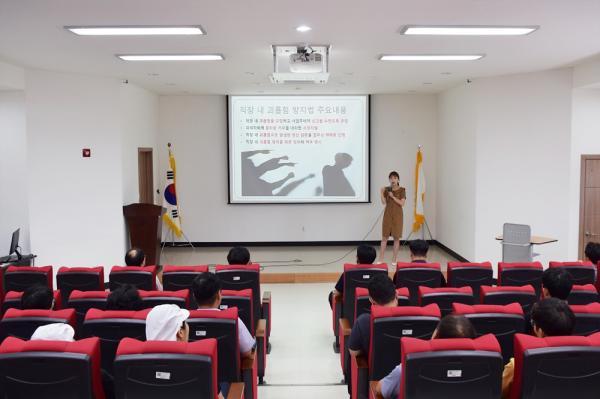 이날 교육은 직장내 괴롭힘 금지법에 대한 주요 내용과 괴롭힘의 유형별 사례, 괴롭힘 판단과 대응 절차 등의 내용으로 진행되었으며, 특히 직장내 괴롭힘 예방을 위해 배려와 공감을 기반으로 한 소통의 중요성을 역설하며 직장예절과 스트레스 관리방법 등을 소개했다.