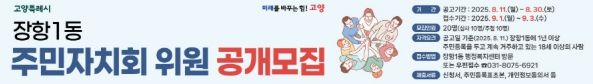 미디어라이프 중부신문 이종인 기자 | 고양특례시 일산동구 장항1동은 2025년 하반기 주민자치회 위원 및 선정위원회 위원을 공개 모집한다고 밝혔다.