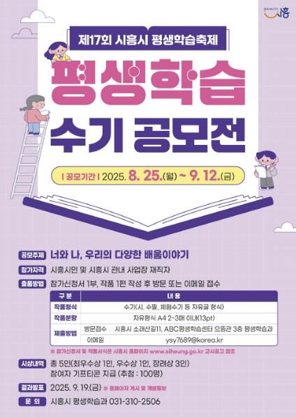 미디어라이프 중부신문 이종인 기자 | 시흥시는 시민들의 배움과 성장의 경험을 제17회 시흥시 평생학습축제를 통해 공유하고자 '시흥시 평생학습 수기 공모전'을 개최한다. 이번 공모전은 평생학습을 통해 변화와 성장을 경험한 시민들의 이야기를 발굴하고, 학습 문화를 확산하는 데 목적이 있다.