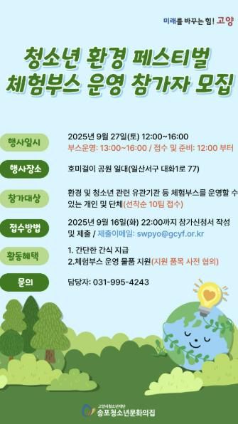 청소년 환경 페스티벌은 9월 27일 호미걸이공원에서 열리며, 환경과 관련된 다양한 무료체험부스, 청소년들이 준비부터 판매까지 직접 참여하는 공유장터(플리마켓)가 운영될 예정이다.