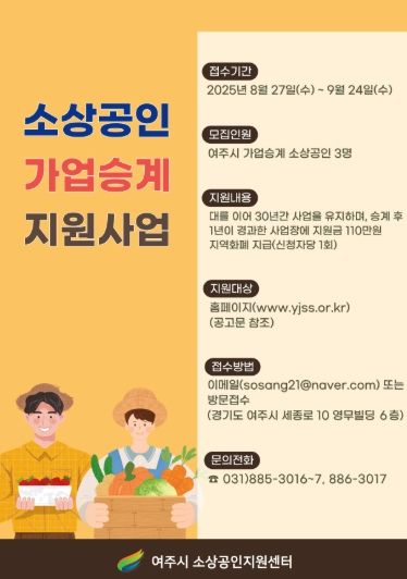 미디어라이프 중부신문 이종인 기자 | 여주시는 여주시소상공인지원센터 주관으로 ‘2025년 소상공인 가업승계 지원사업’의 참여 대상 업체를 오는 8월 27일부터 9월 24일까지 모집한다.