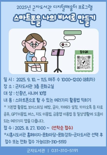 미디어라이프 중부신문 이종인 기자 | 시흥시 군자도서관은 디지털 환경에 익숙하지 않은 신중년, 어르신 세대를 대상으로 ‘스마트폰을 나의 비서로 만들기’ 디지털배움터 프로그램을 오는 9월 10일부터 운영한다.