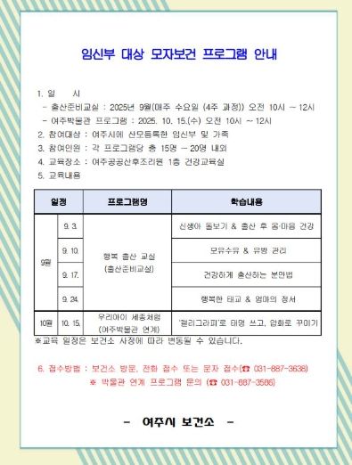 미디어라이프 중부신문 이종인 기자 | 여주시보건소 건강증진과는 관내 임신부 및 가족을 대상으로 출산과 육아에 대한 실질적인 도움을 제공하기 위해 총 4회에 걸쳐 2025년도 하반기 '출산준비교실'을 운영한다.