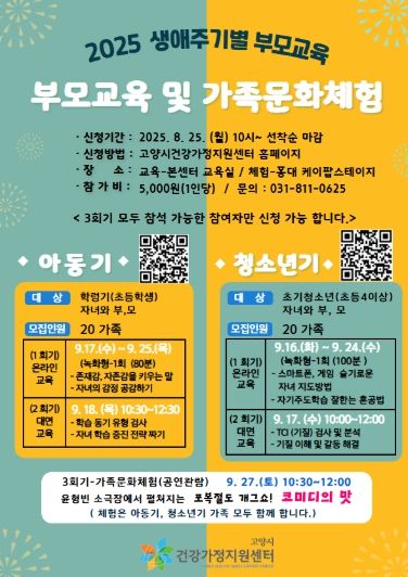 아동기 부모교육은 9월 17일부터 25일까지 온라인 교육 진행 후 9월 18일 고양시 건강가정지원센터에서 ‘자녀학습 증진 전략’ 등에 대해 대면으로 교육한다.