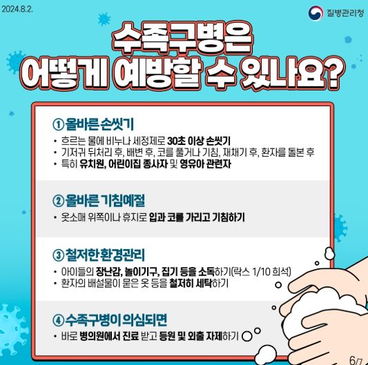 수족구병은 특히 0~6세 영유아에서 높은 발생을 보여 어린이집과 유치원 등에서 장난감, 문손잡이 등 손이 닿는 집기 및 주변 환경의 소독관리를 철저히 해야 한다.
