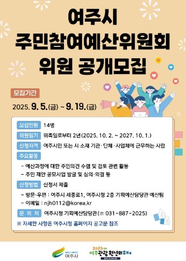 미디어라이프 중부신문 이종인 기자 | 여주시는 지난 9월 5일부터 오는 9월 19일까지 2주간 주민참여예산제 운영을 위한 위원 14명을 공개 모집한다.