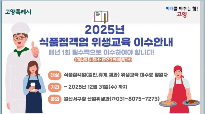 미디어라이프 중부신문 이종인 기자 | 고양특례시 일산서구는 식품접객업 영업자의 위생관리 수준 향상과 안전한 외식문화 조성을 위해, 2025년 정기 위생교육 미이수자를 대상으로 집중 안내 활동을 추진한다고 밝혔다.