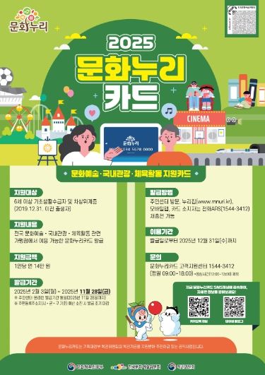 지원 분야는 영화·도서·음반·테마파크·여행·스포츠 등 다양하며, 문화누리카드를 발급받은 시민들은 온·오프라인 가맹점에서 확인 가능)이나 온라인 사용처, 찾아가는 문화장터 등을 통해 풍성한 혜택을 누릴 수 있다.