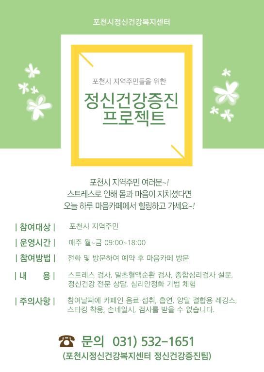 미디어라이프 중부신문 이도경 기자 | 포천시는 지난 12일 포천시정신건강복지센터와 함께 시민들의 정신건강 증진과 스트레스 조기 관리를 위해 ‘마음카페’를 운영하고 있다고 밝혔다.