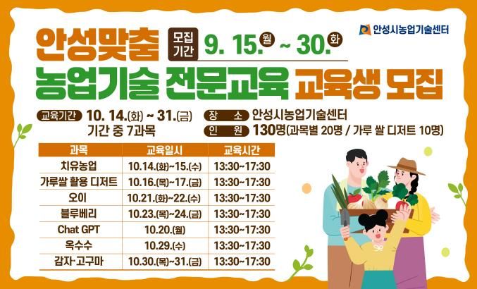 미디어라이프 중부신문 이종인 기자 | 안성시농업기술센터는 오는 9월 15일부터 30일까지 안성맞춤 농업기술 전문교육 교육생을 모집한다고 밝혔다.