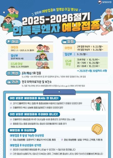 올해 국가 무료예방접종 대상은 생후 6개월 이상~만 13세 어린이(2012년 1월 1일부터 2025년 8월 31일 출생자), 65세 이상 어르신(1960년 12월 31일 이전 출생자), 임신부이다.